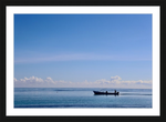 Unit price perHigh quality photography print of a blue seascape in Jamaica, featuring the dark silhouette of a fisherman's boat. Photo and frame are included. The natural wood frame size is 3/4 inches, with 1 inch white matting.